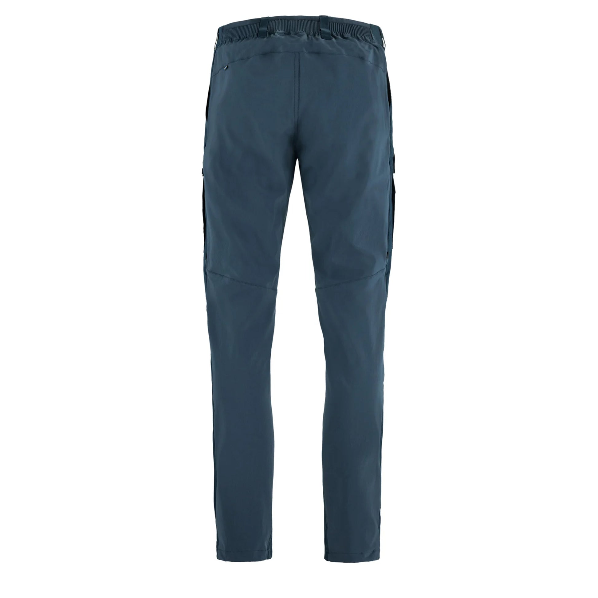 The Fjällräven Abisko Hybrid Trail Trousers in Navy offer versatile performance in true Fjällräven style. Made with G-1000 Lite Stretch on the front and full stretch recycled polyamide elastane fabric on the back, these trousers are designed for comfort and functionality. The front can be waxed for enhanced weather resistance, while the back provides excellent ventilation and freedom of movement. Featuring an elasticated waist for a comfortable fit, zippered ventilation openings, open hand pockets and buttoned leg pockets, one with a zipper, these trousers are perfect for outdoor adventures.