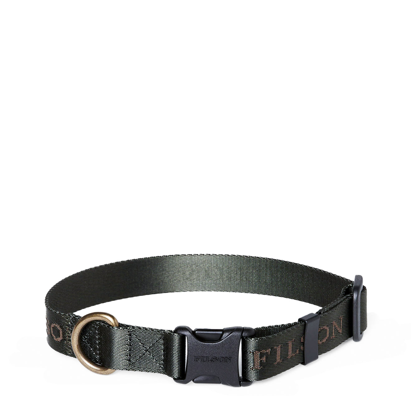 The Filson Nylon Dog Collar in Dark Timber is designed for active dogs who love outdoor adventures. Made from tough 1-inch wide webbing, it's washable, quick-drying, and odor-resistant. The rustproof industrial-strength plastic hardware ensures durability, while the collar is infinitely adjustable for a custom fit. A solid brass D-ring provides a secure attachment for your leash, and the custom Filson logo adds a touch of signature style. Perfect for dogs on the go.