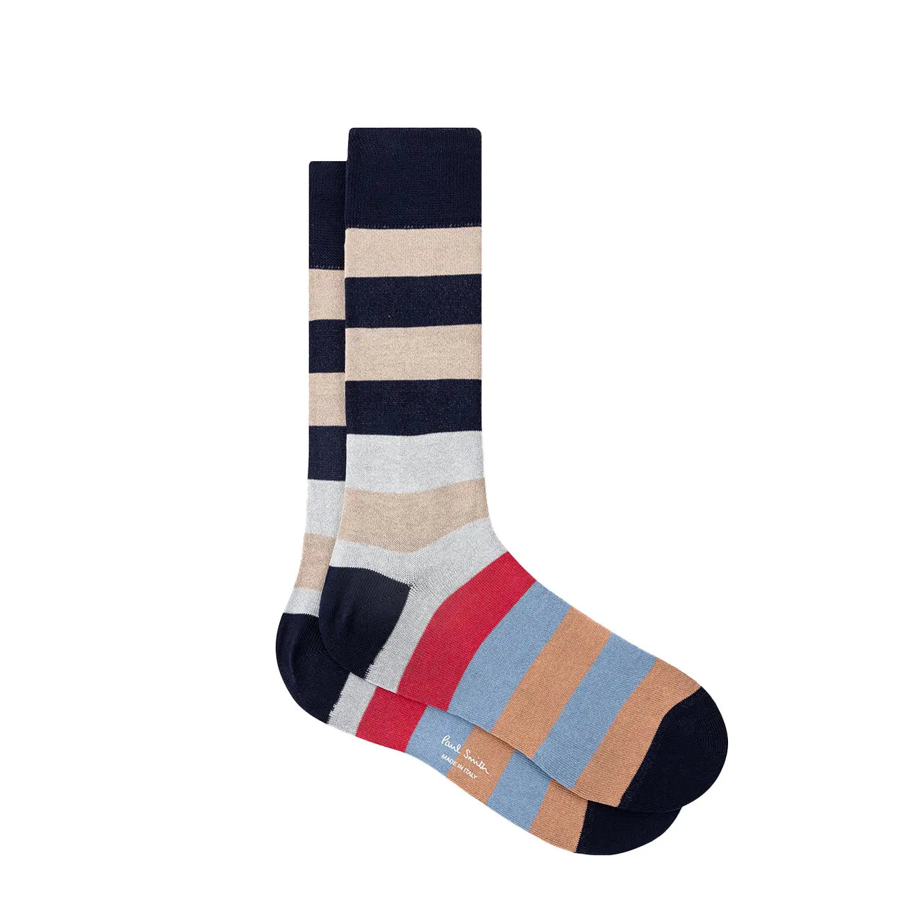 Made in Italy from a soft cotton-blend, these socks feature a multi-block stripe pattern with a navy base. Ideal for adding a subtle injection of colour to your outfit.
