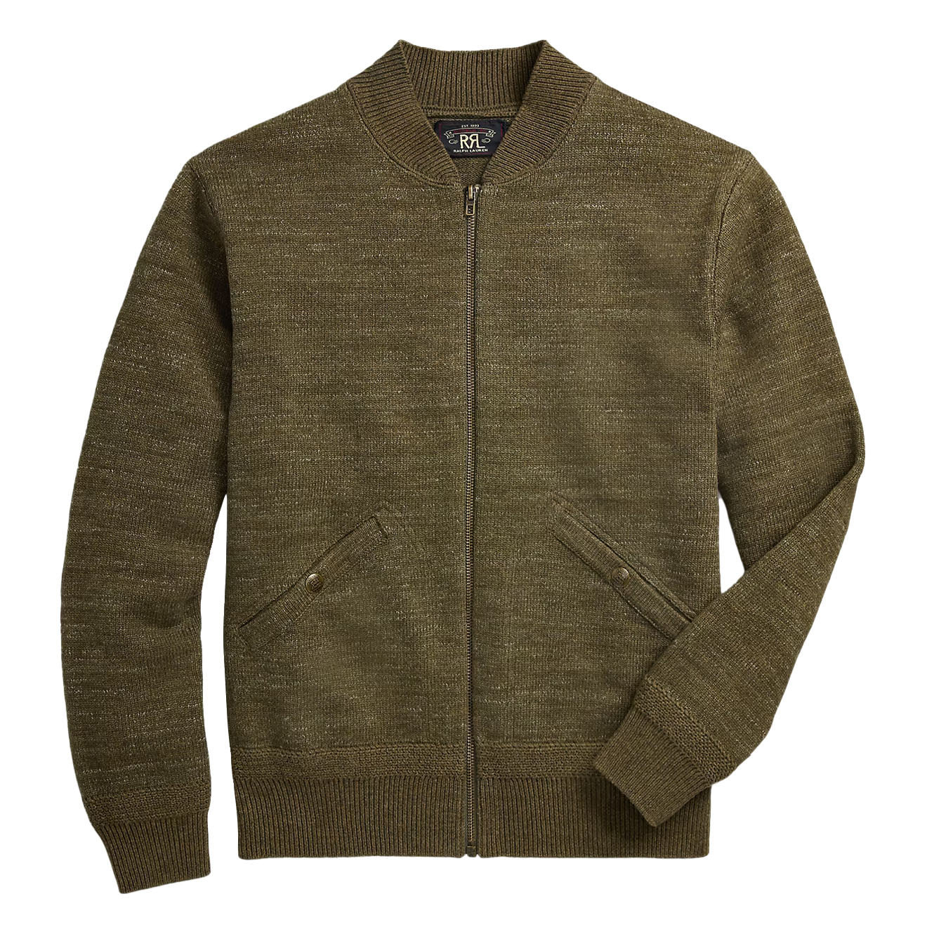 Crafted with a blend of cotton and wool yarns, the RRL By Ralph Lauren Cotton-Wool Full-Zip Jumper in Olive Heather features a surplus-inspired style. Featuring a full-zip front and jersey-stitch construction, this jumper also boasts rib-knit collar, cuffs, and hem for added comfort.