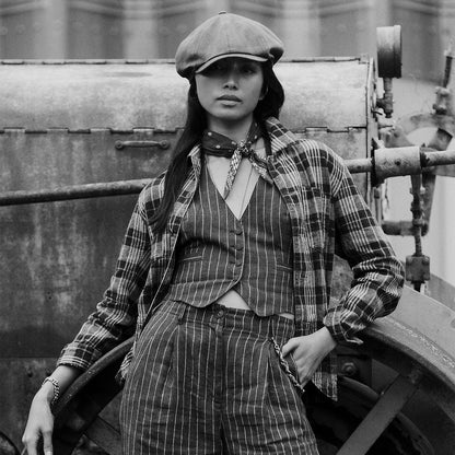 The RRL by Ralph Lauren Women's Teagan Long Sleeve Shirt in Indigo/Tan is a lightweight jacket crafted from rustic cotton-and-linen cloth, providing a homespun-inspired feel. The plaid pattern is based on a vintage textile, yarn-dyed with various shades of true indigo to create tonal dimension throughout. Modelled after early 20th-century workwear, it features distressed metal buttons for an authentic touch.